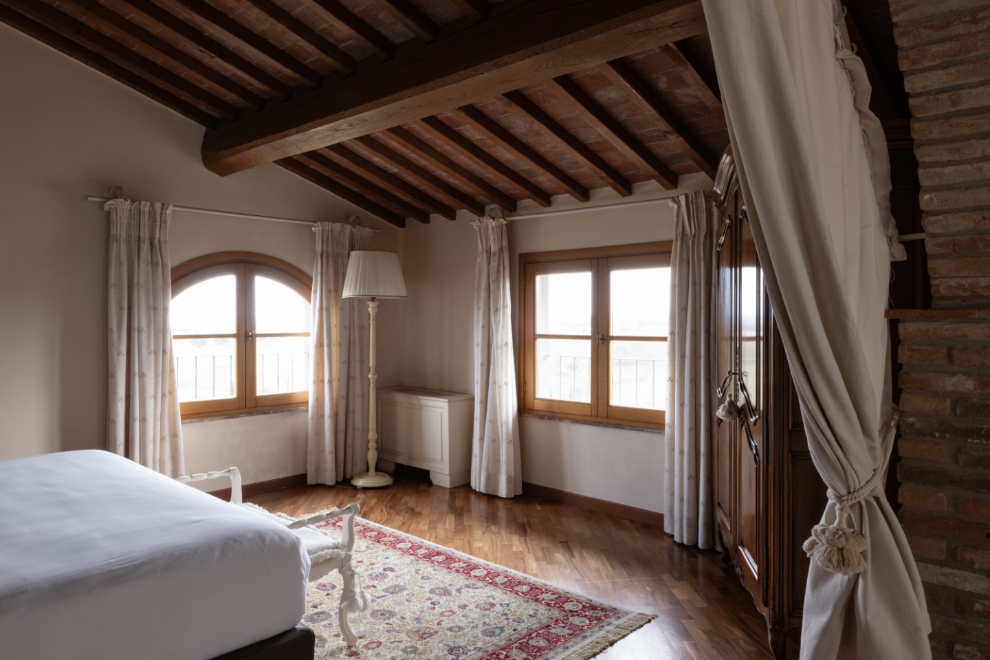 Die Renovierung wurde mit vielen der Originalmaterialien durchgeführt, zum Einsatz kamen noch gut erhaltene Holzbalken, Cotto oder Stein, und die Architektur schmiegt sich harmonisch in die Landschaft. Gepaart wurde das Alte mit dem Neuen, und zwar durch den Einsatz von modernen Technologien, die für Energieeffizienz sorgen.