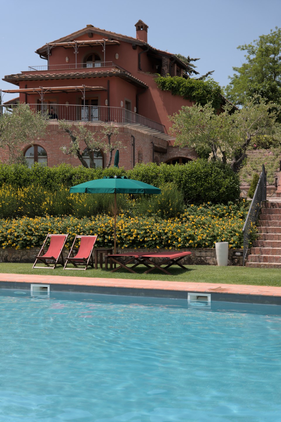 Der Blick geht über Zypressen-gesäumte Weinberge, Schatten spenden die Olivenbäume. Auch ein kleiner Hydromassagepool steht den Gästen zur Verfügung.