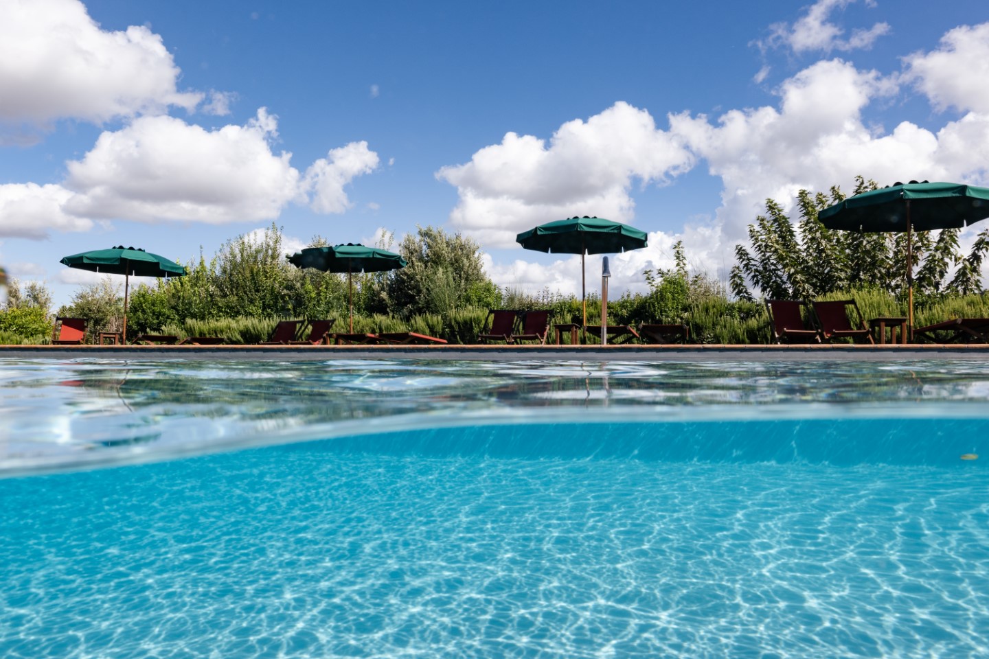 Alles dreht sich um das Schwimmbad im Garten, das von Ende April bis Oktober geöffnet ist. Umgeben von Wiesen und Liegestühlen gibt es dort auch einen großen schattigen Tisch.