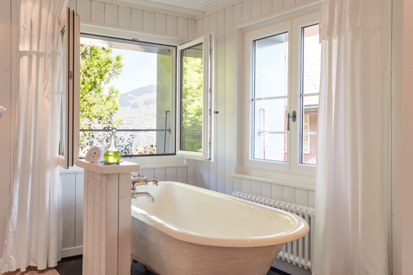 Zurück im Hotel gönnt man sich zuerst ein Bad in der freistehenden Badewanne, bevor der gemeinsame Apéro je nach Wetter im charmanten Schlüsselgärtli oder in einer der gemütlichen Gaststuben lockt.