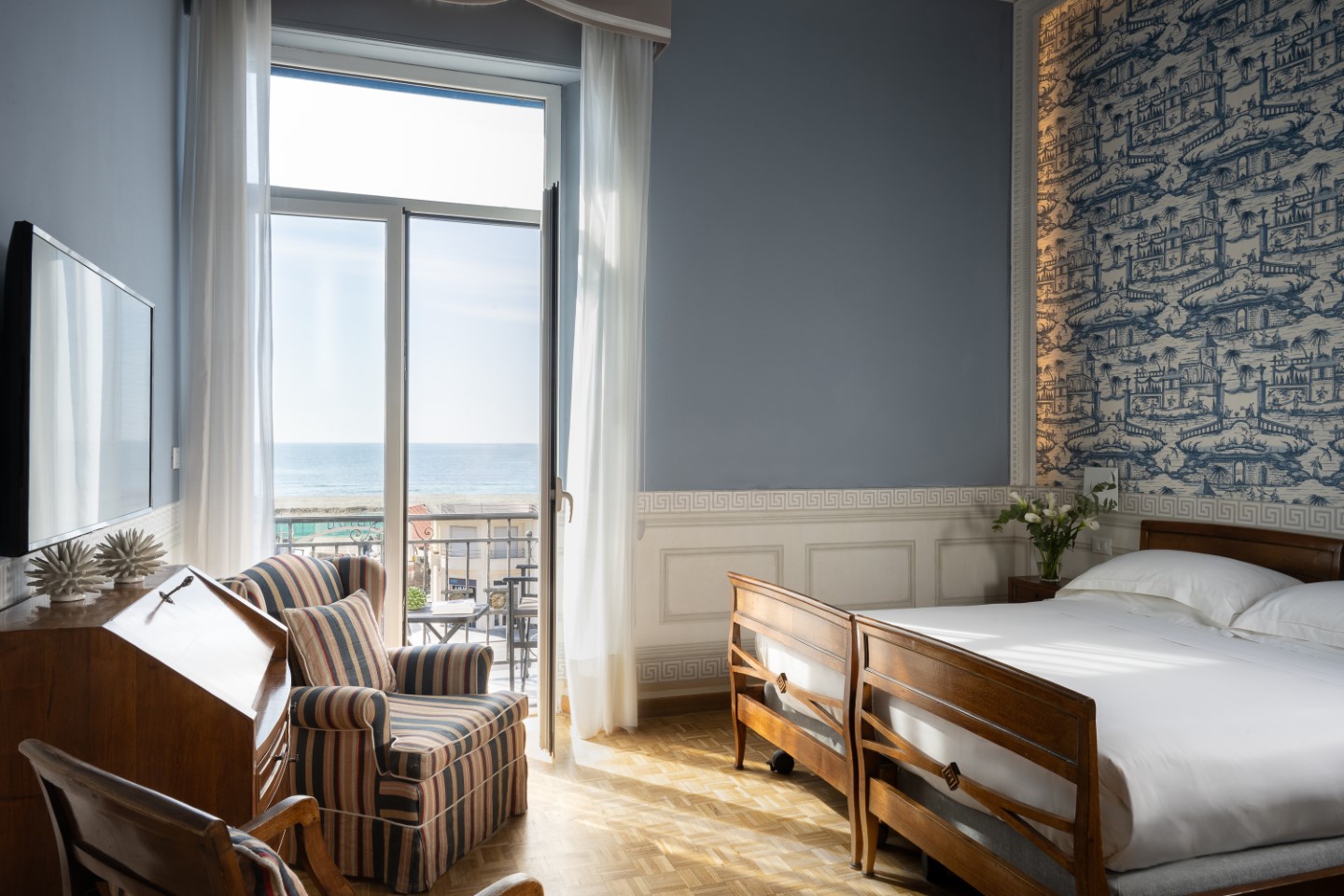 Direkt an der Promenade liegt das Boutiquehotel Palace Viareggio. Das beeindruckende Gebäude ist ebenfalls im Liberty-Stil erbaut und ein Paradebeispiel dafür, wie eine feinfühlige Renovierung ein 110 Jahre altes Haus in die Moderne transportieren kann.