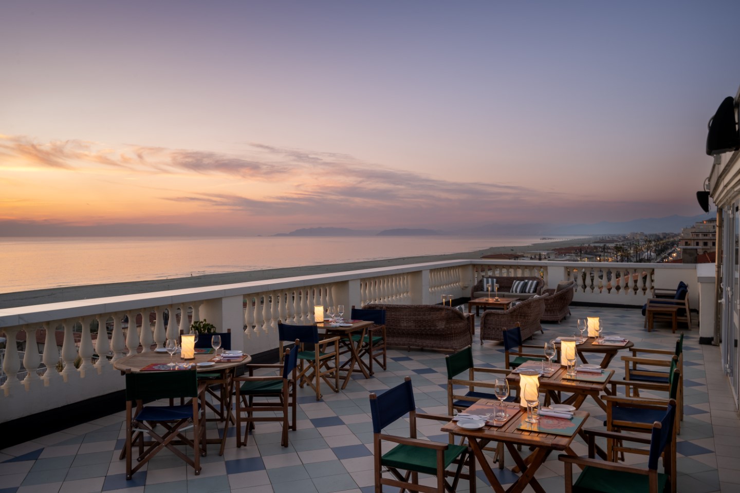 Bei Sonnenuntergang lockt der Aperitif auf die Terrasse des Palace Viareggio, der nahtlos ins Abendessen übergeht. Und manch einer bleibt auch noch für den Cocktail nach dem Abendessen da, bevor es ins bequeme Bett mit historischem Flair geht.