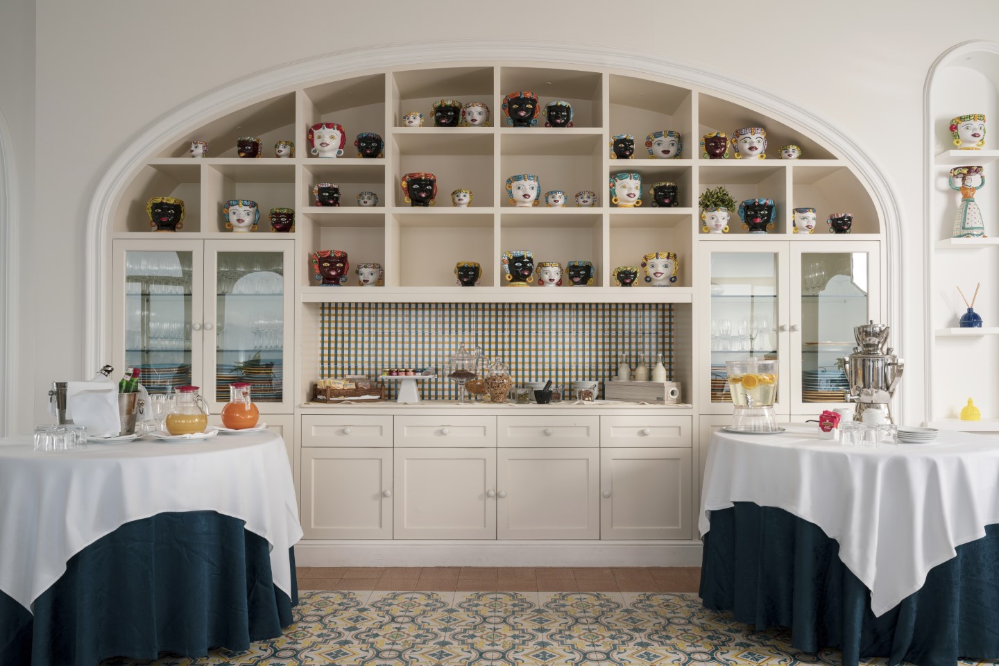 Klassisch mediterran ist die Atmosphäre im Inneren des Hotels und damit genau so, wie sie sein soll. Fliesen in Cotto und die Farben der Amalfiküste: Weiß steht für die Frische der Häuser, Blau für Meer und Himmel, Gelb und Orange für die Zitrusfrüchte, aber auch für die magischen Sonnenuntergänge.