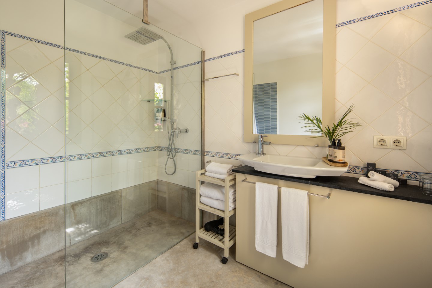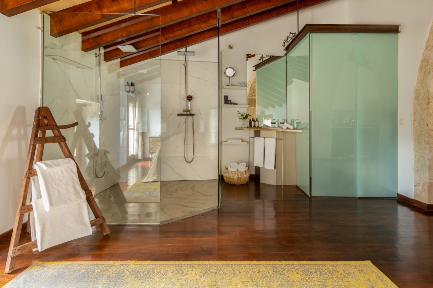Minimalismus trifft traditionellen mallorquinischen Stil – weniger ist mehr und jedes Detail stimmt. Jeder Raum ist komplett verschieden, was Größe, Dekoration und Farbschema, aber auch die architektonischen Elemente anbelangt.