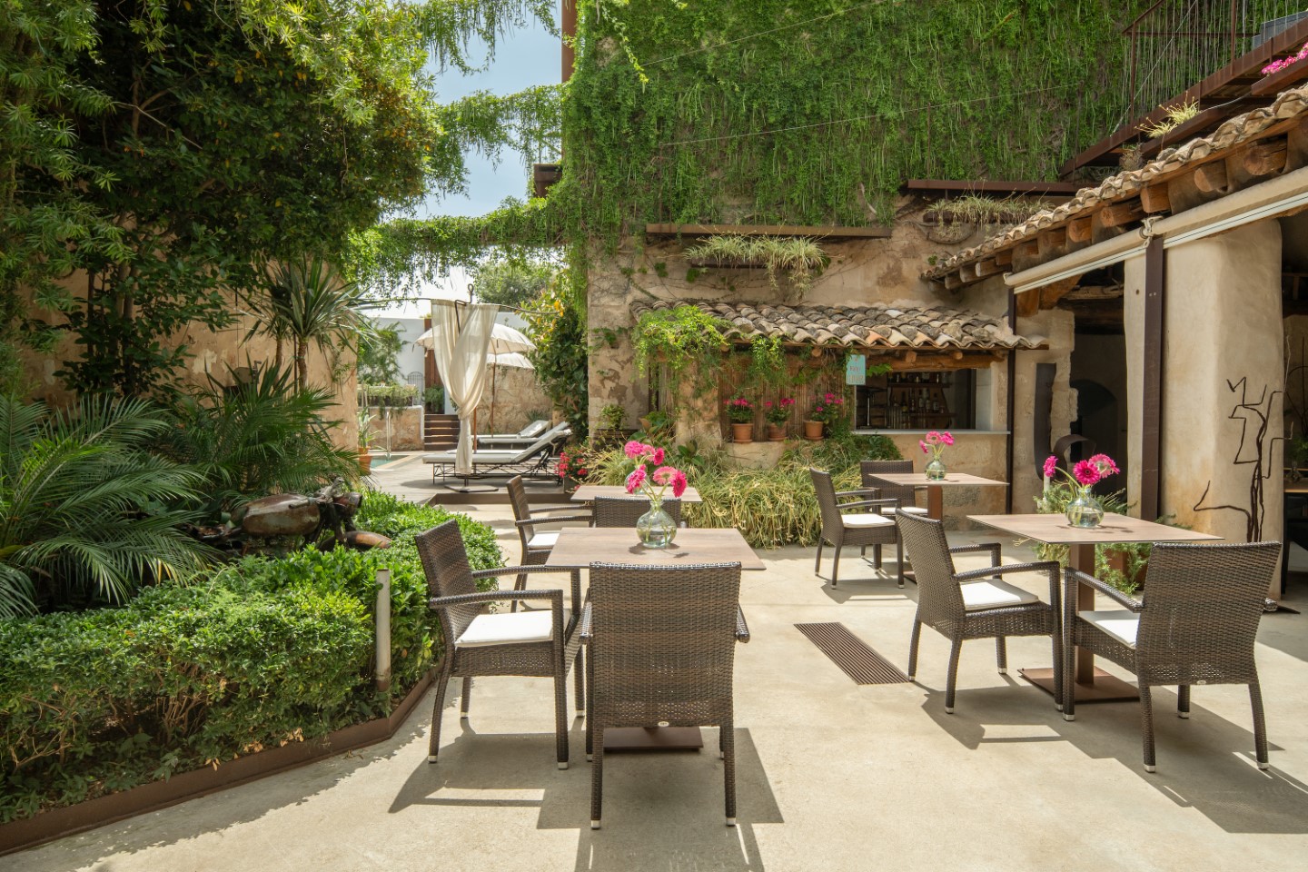 Herz des Anwesens ist der 8×4 Meter große Salzwasserpool, rundherum locken gemütliche Liegen und Hängesessel. Den ganzen Tag über lädt der begrünte Innenhof dazu, kulinarische Köstlichkeiten zu probieren oder Weine aus dem Weinkeller des Anwesens zu verkosten.