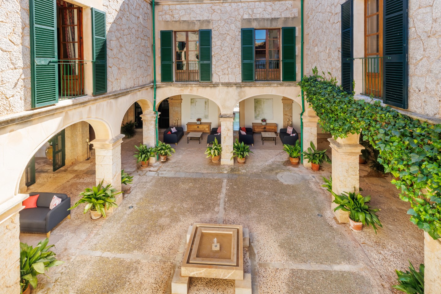 Magische Stimmung herrscht im Innenhof, der nachts besonders harmonisch beleuchtet ist und durch architektonische Schönheit hervorsticht. Das Hauptgebäude ist typisch mallorquinisch, ein Gebäude im kolonialen Stil wurde dazu gebaut – so gibt es viele Gegensätze, die zusammen eine tolle Mischung ergeben.