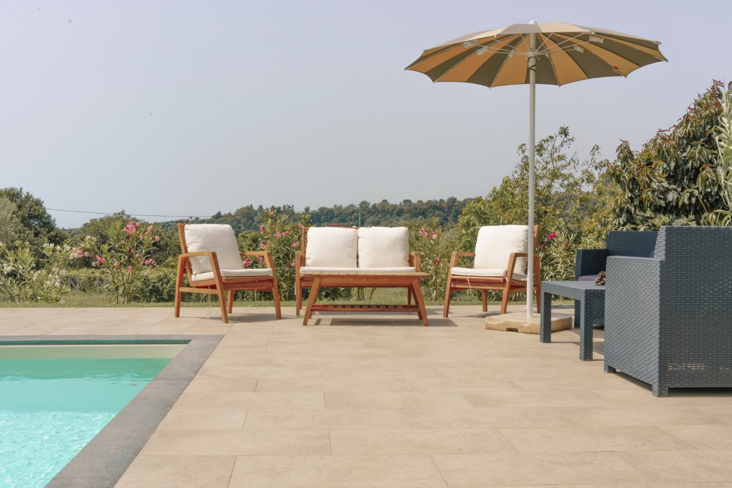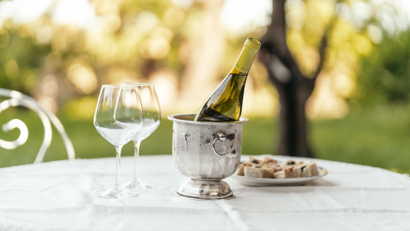 Zwischen Weinreben, dem Olivenhain, aber auch Magnolien- und Avocadobäumen, ist der Pool gelegen. Keine Musik und kein Lärm stören die Ruhe, nur die Vögel singen, die Zikaden zirpen und die Gräser rauschen leise im Wind. Hier werden am Nachmittag auch Getränke serviert – so müssen sich Adam und Eva gefühlt haben, bevor sie aus dem Paradies vertrieben wurden.