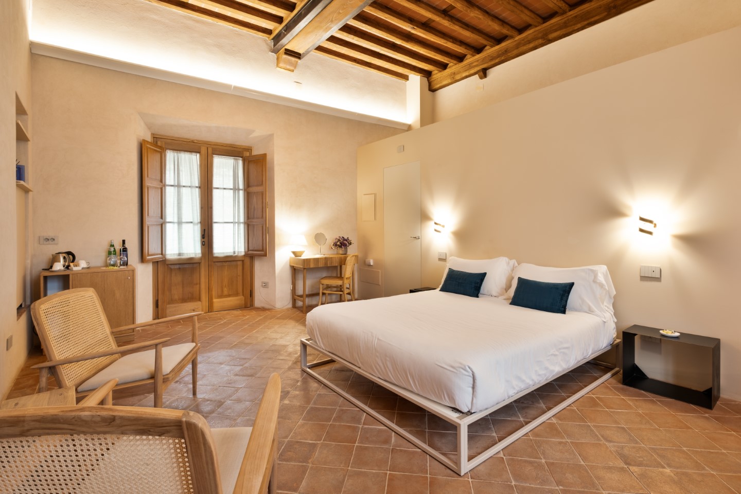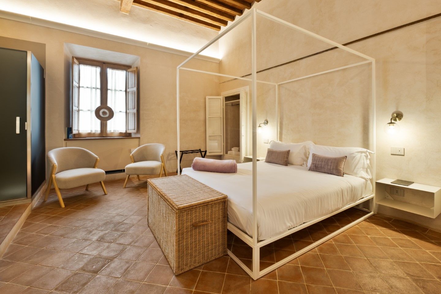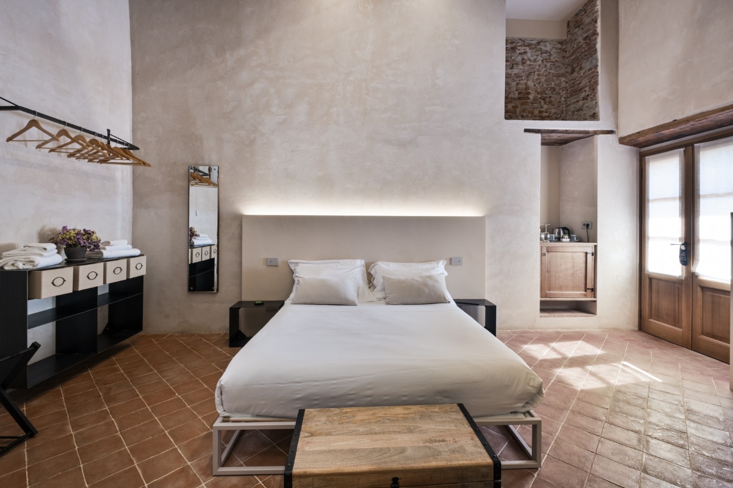 Die Architektur des Benediktinerklosters ist überall Protagonistin und wird durch viel freie Flächen und minimalistische Einrichtungsstücke hervorgehoben. Jedes Zimmer hat seine individuellen Besonderheiten: Holzbalkendecken, originale Fußböden aus dem Mittelalter, geheime Nischen oder sichtbare Steinwände.