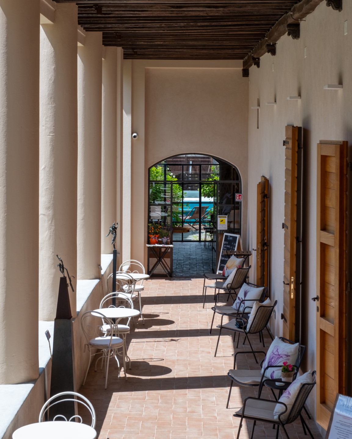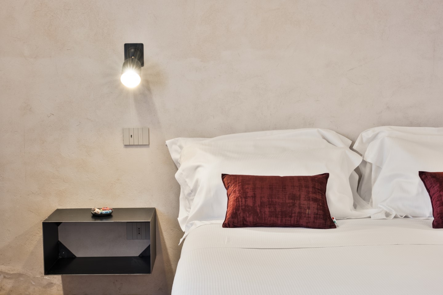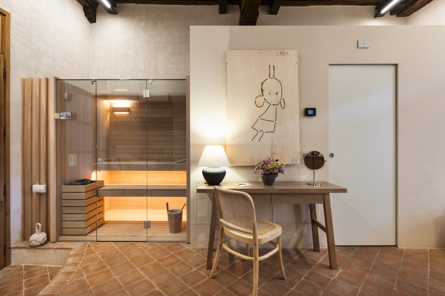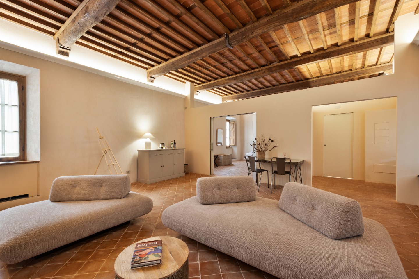 Die Architektur des Benediktinerklosters ist überall Protagonistin und wird durch viel freie Flächen und minimalistische Einrichtungsstücke hervorgehoben. Jedes Zimmer hat seine individuellen Besonderheiten: Holzbalkendecken, originale Fußböden aus dem Mittelalter, geheime Nischen oder sichtbare Steinwände.