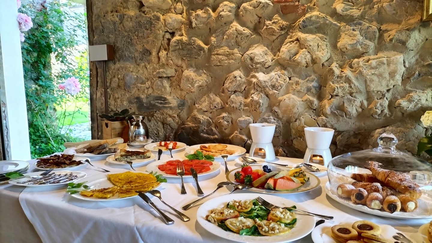 Das Frühstück in der Toskana ist traditionell auf der süßen Seite, doch das Buffet hält für jeden Geschmack etwas bereit: Kekse und Gebäck, Bruschette, Quiches, Käse und auf Wunsch auch Aufschnitt und Eierspeisen. Angerichtet wird im schönen Frühstücksraum mit antiken Steinmauern und Holzofen oder im zauberhaften Garten unter der Pergola.