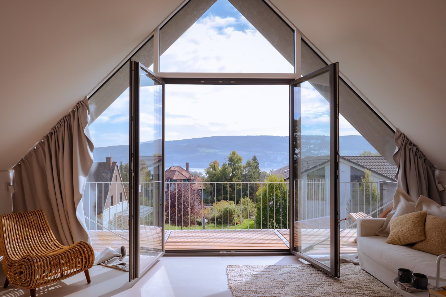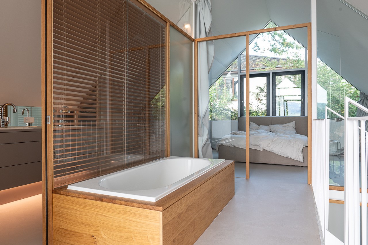 Seeblick, Sicht auf das historische Wohnhaus von Mia und Hermann Hesse (die Namensgeber der Ferienhäuser), luftige, helle Architektur, viel Transparenz und dennoch Gemütlichkeit. Das alles steckt zwischen Satteldach und Glasfronten der modernen Ferienhäuser mit ihren jeweils 140 Quadratmetern.