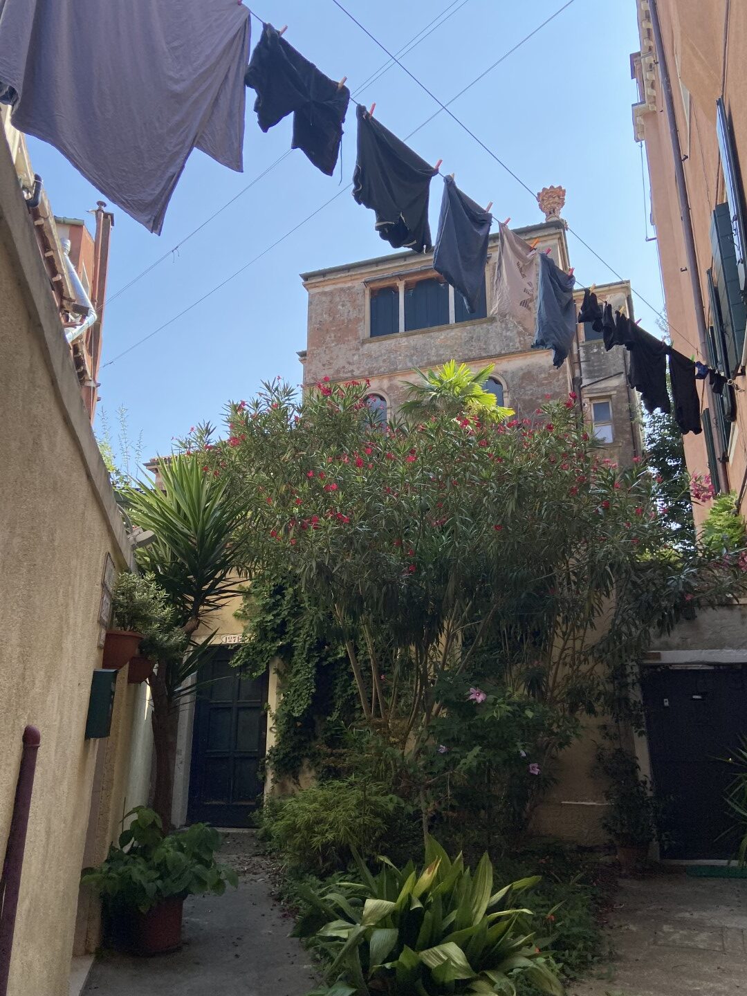 Einmal Venedig mit allem bitte! Etwas abseits vom Trubel und mittendrin im echten Leben der Venezianer liegt das Biennale Hideaway: Eine kleine Wohnung im dritten Stockwerk eines typisch venezianischen Wohnhauses. Für den steilen Aufstieg über die Treppen wird man oben mit einem tollen Ausblick belohnt.  Das Markusbecken liegt direkt vor dem Fenster, mit einer türkisen Farbe, wie sie nur in der Lagune von Venedig möglich ist. Hier versinkt abends die Sonne blutrot hinter der „Skyline“ der Lagunenstadt. Während der Biennale kann man sogar auf die künstlerischen Installationen blicken.