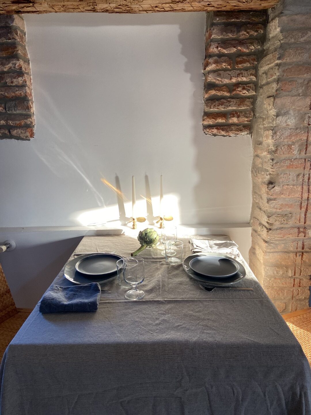 Die Wohnung selbst ist mini, aber mit Maxi-Charme. Im über zwei Ebenen aufgeteilten Loft für zwei Personen (auch mit Hund!) regieren Holzbalken und Dachschrägen und es ist so richtig gemütlich. Man fühlt sich hier das ganze Jahr über wohl, auch im Winter, wenn die leuchtenden Farben Venedigs zu Pastelltönen werden und auf den Straßen Menschen unterwegs sind, die einander beim Vornamen kennen. Dass die Küche eher klein und essentiell ausgestattet ist, tut dem Komfort keinen Abbruch. Schließlich warten in der nahen Via Garibaldi mehrere Bars mit leckeren Häppchen (den Cicchetti) und der Spritz wird hier traditionell mit Sekt servieren.