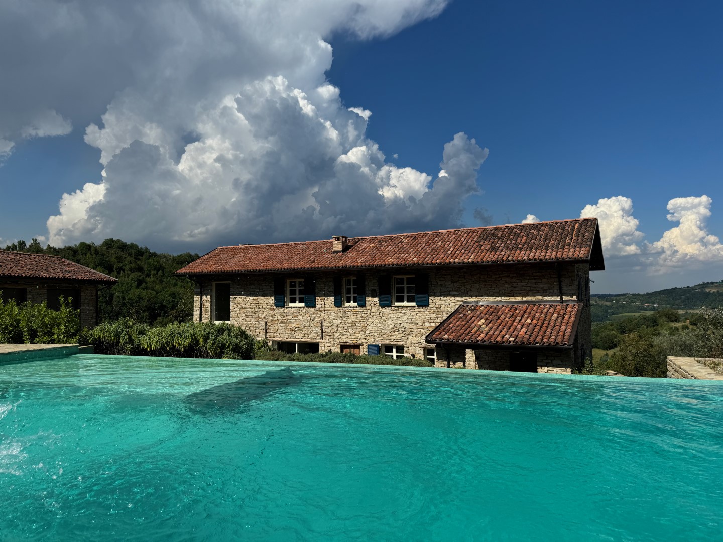 Die gesamte Villa aus Stein im piemontesischen Stil, mit den frischen blauen Fensterläden, wird den Besuchern für die ganze Zeit des Aufenthalts zur Verfügung stehen. Der Pool glitzert auch schon verlockend. In solchen Momenten möchte man sein Glück packen und es für immer festhalten!