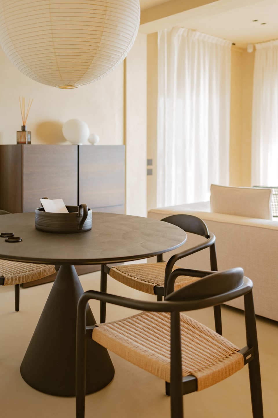 Neutrale Töne und schwarze Küchen finden Akzente von Farbe in den Keramiken aus Grottaglie, der nahen Keramikstadt. Die weiche Bettwäsche aus Leinen ist ein Erlebnis und macht die warmen Sommernächte in Apulien noch schöner.