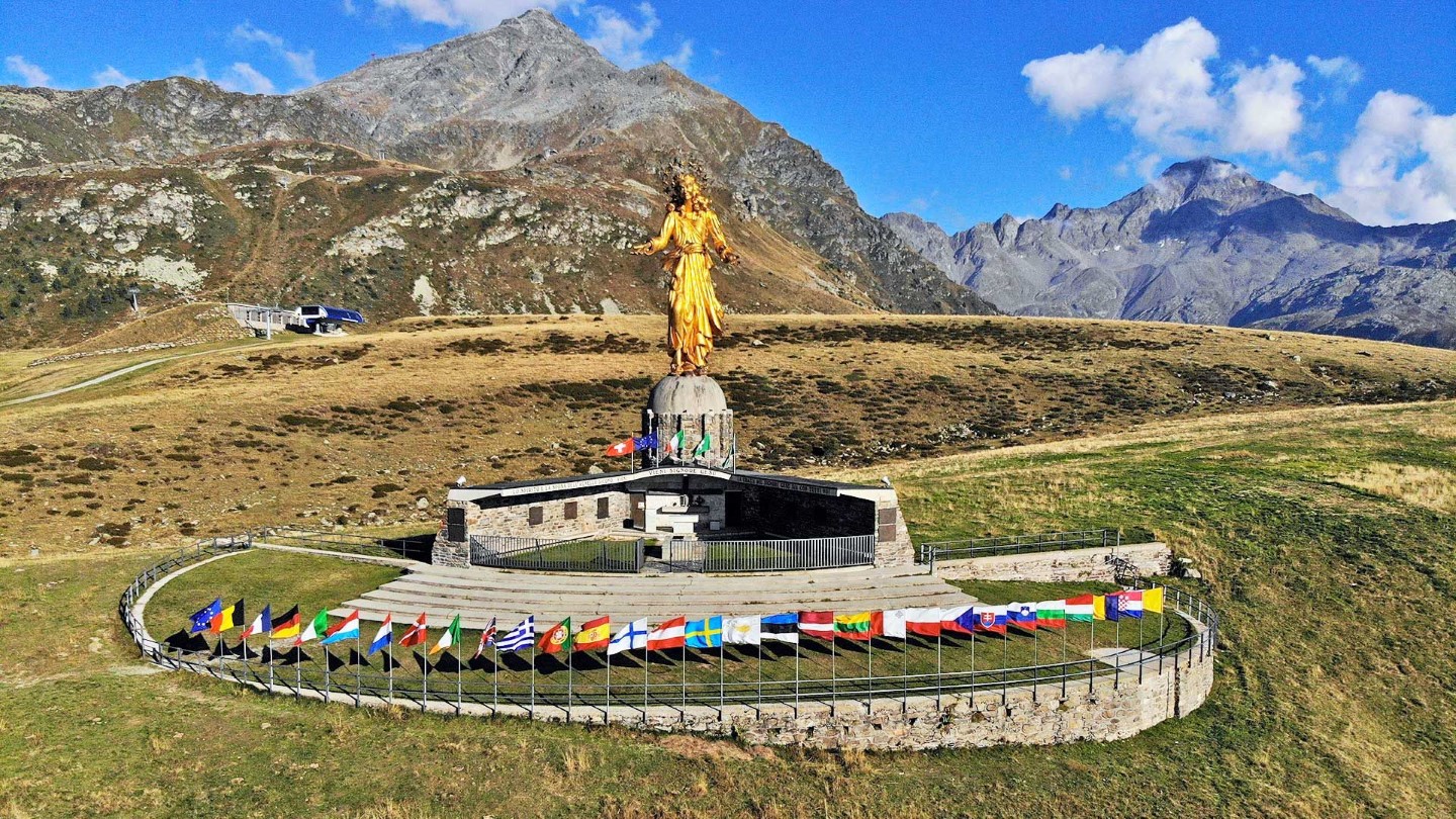 Golden glänzt die 13 Meter hohe Statue der Jungfrau Maria im Sonnenlicht, unweit grasen unbeeindruckt die Rinder. Auf knapp 2000 Metern Höhe steht sie über Motta, dominiert die Landschaft und regt zu Besinnung und Gebet an.