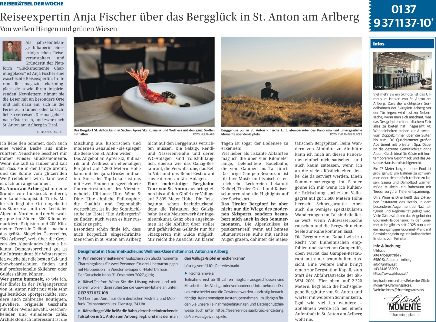 Charmingplaces-Gründerin Anja Fischer nimmt Sie in den großen Tageszeitungen Saarbrücker Zeitung, Trierischer Volksfreund und Südkurier mit auf eine Entdeckungsreise: Heute präsentiert sie ihren Insidertipp St. Anton am Arlberg in Tirol.