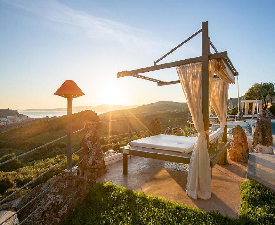 Inmitten von Kaktusfeigen und Myrtenbäumen steht auf einer Anhöhe über Castelsardo das Viersterne-Superior-Hotel Bajaloglia Resort. Der Blick von hier oben geht über den Golf von Asinara, am Horizont verschmilzt Meerblau mit Himmelblau. Von jedem der nur 15 Zimmer des Resorts ist ein atemberaubender Meerblick garantiert und das gilt auch für die Sonnenliegen am beheizten Pool.
