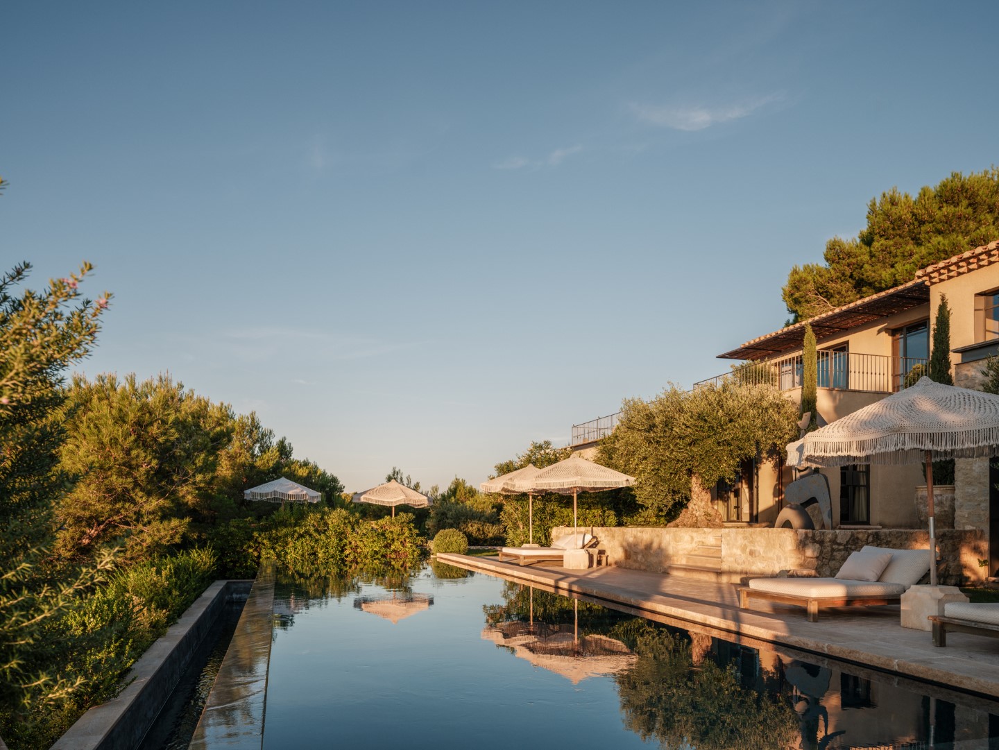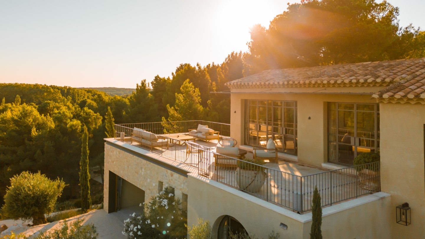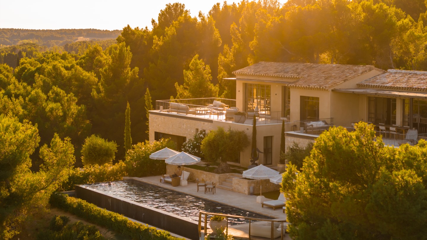 Kalkstein aus Les Baux, Eichenholzböden, antike Kamine und maßgefertigtes Dekor zeichnen die Architektur aus, während große Panoramafenster auf die Terrassen und den beheizten Infinitypool führen.