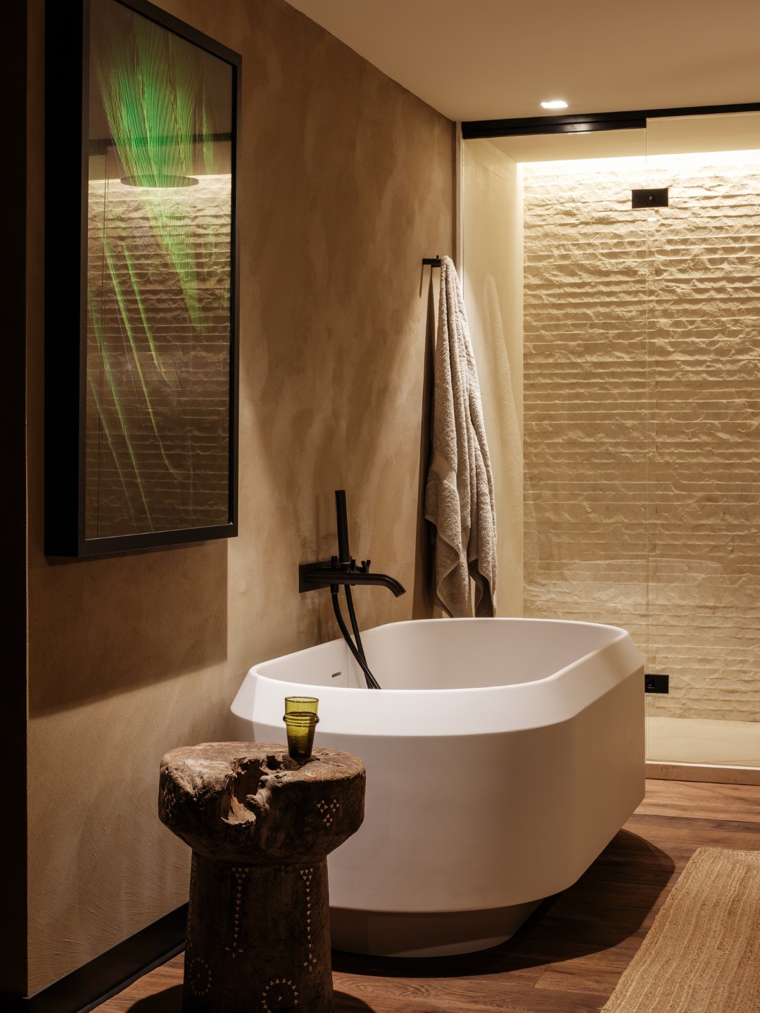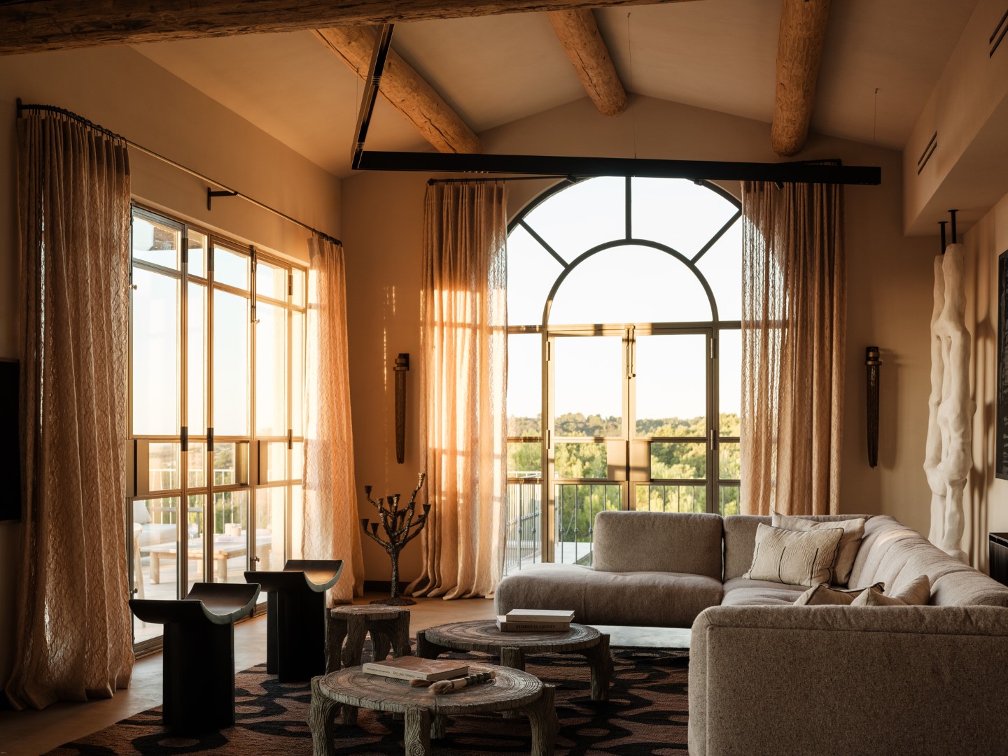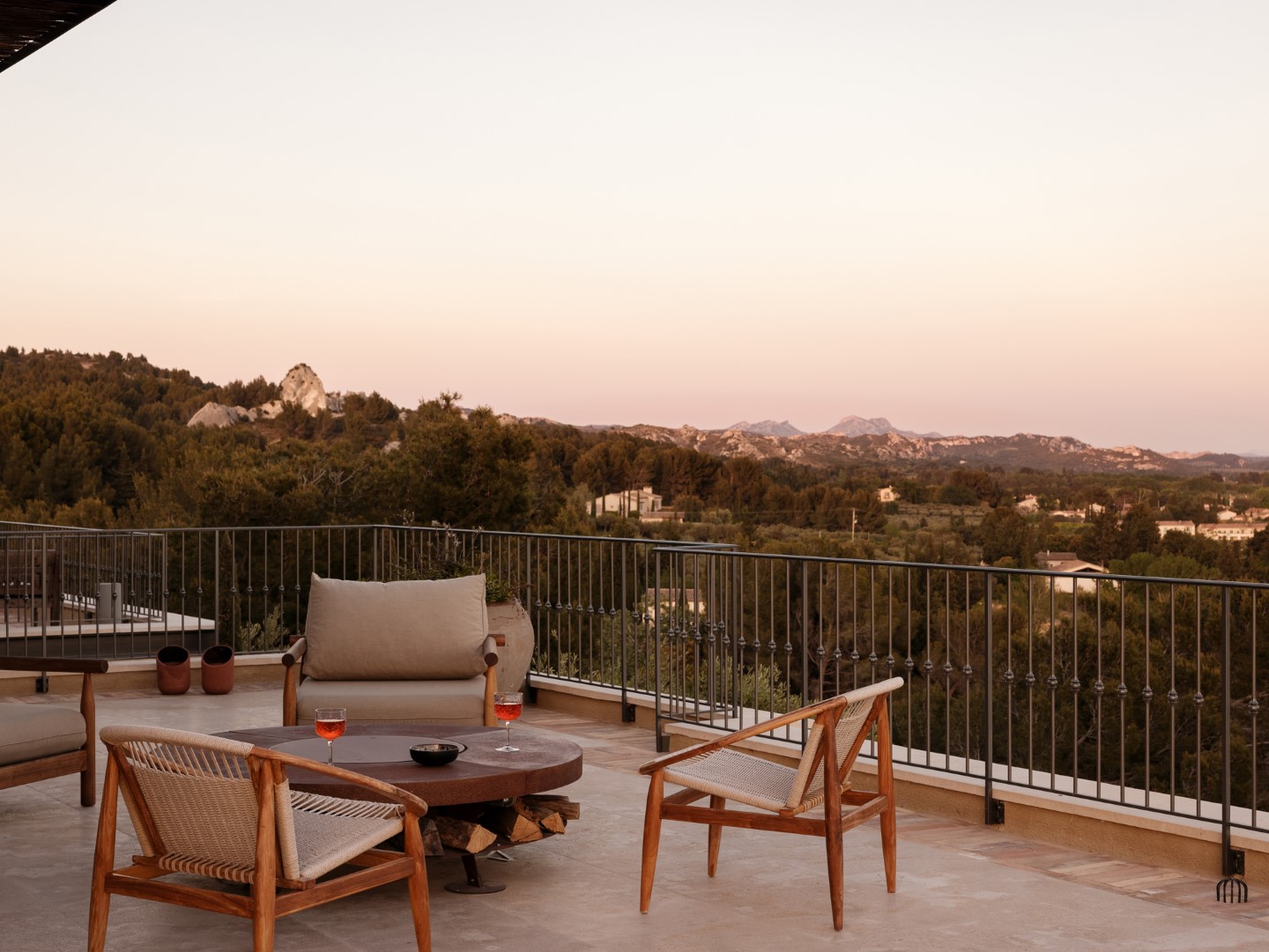 Kalkstein aus Les Baux, Eichenholzböden, antike Kamine und maßgefertigtes Dekor zeichnen die Architektur aus, während große Panoramafenster auf die Terrassen und den beheizten Infinitypool führen.