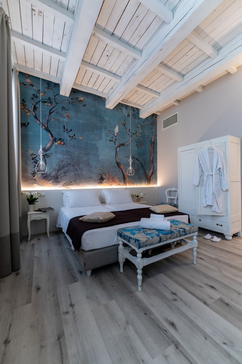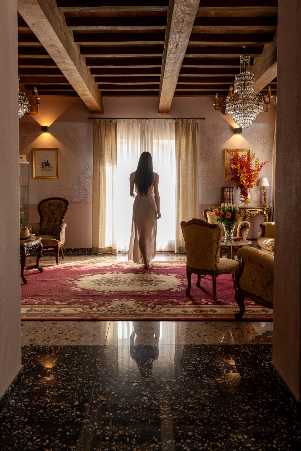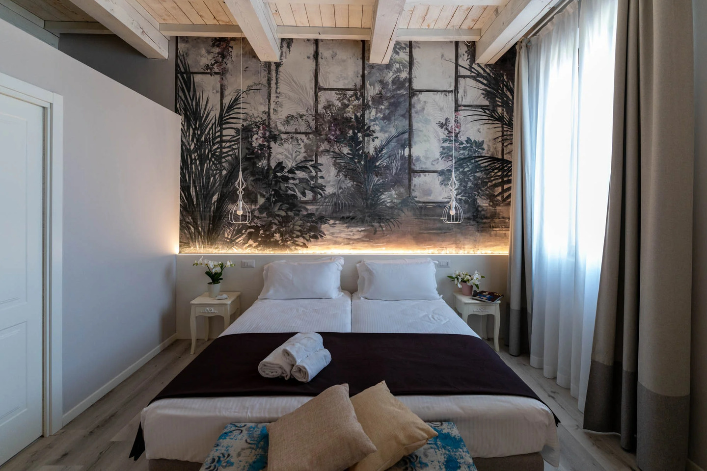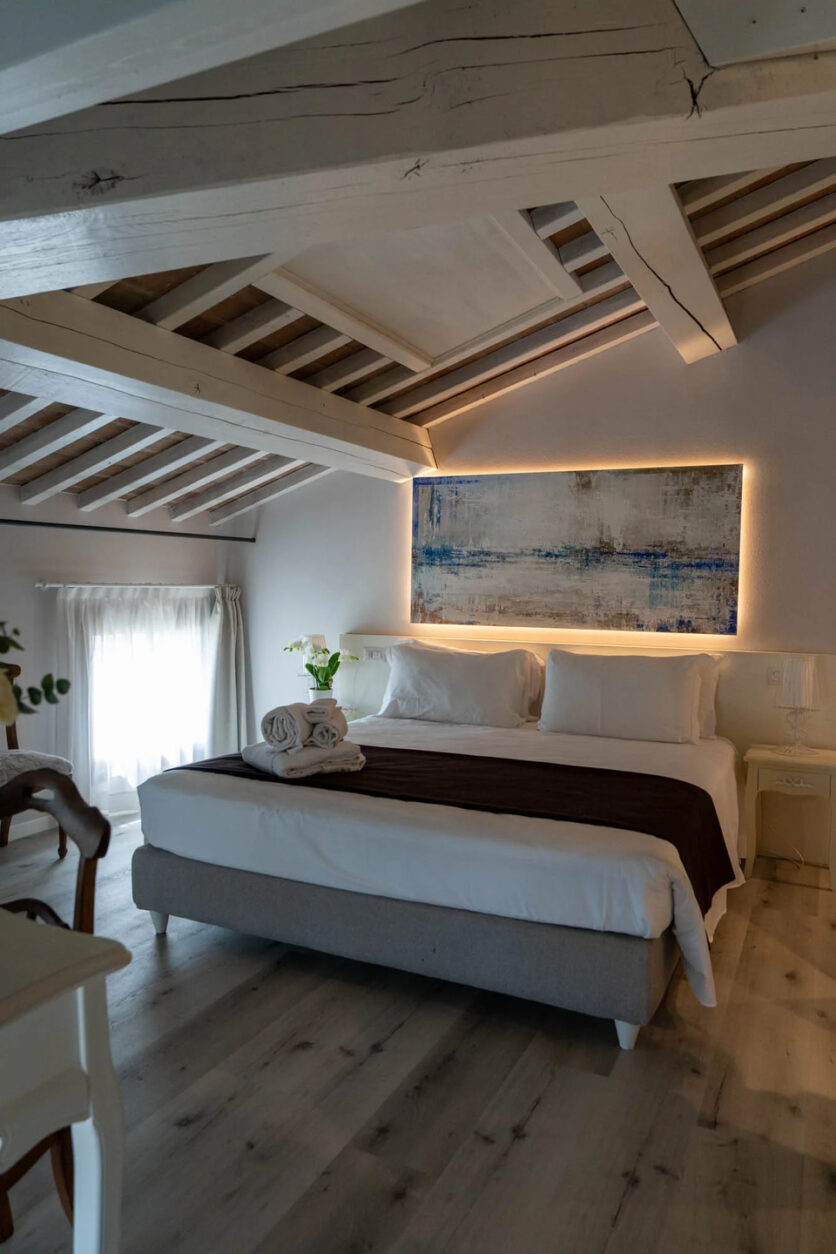 Von den insgesamt zwölf Suiten der Villa sind elf im Turm aus dem Jahr 1100 gelegen. Es gibt keine Standardzimmer, alle Suiten sind individuell gestaltet und unterscheiden sich in Größe, Stil und Dekoration. Antike Möbel treffen auf zeitgemäße Details; Funktionalität und moderner Komfort stehen im Mittelpunkt. Aber auch Kunst spielt eine wichtige Rolle, ebenso wie der respektvolle Erhalt der Geschichte.