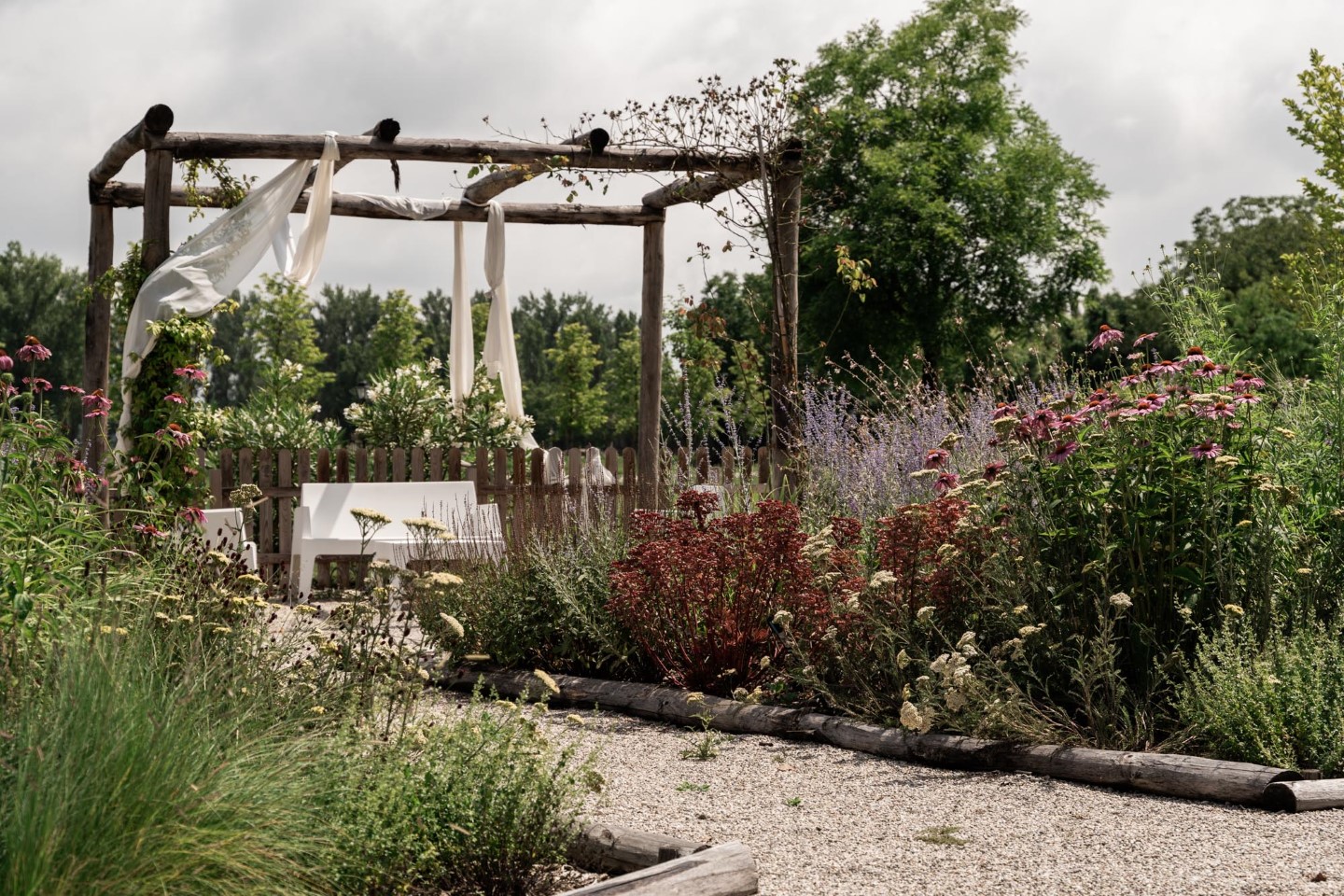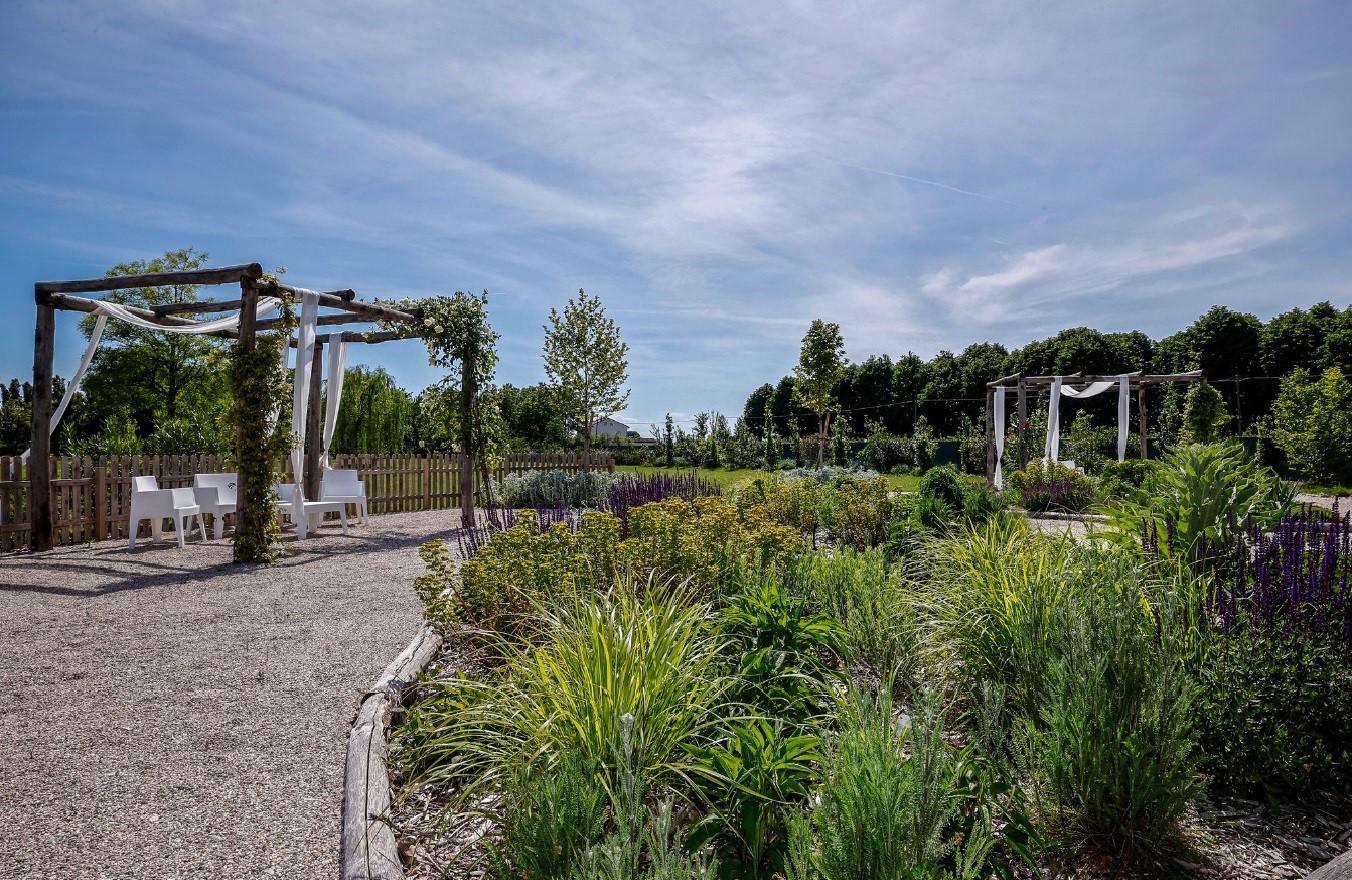 Der 3.500 Quadratmeter große Garten ist ein wesentlicher Teil des Erlebnisses: üppig, voller Blumen und reich an Düften. Die Gäste können dort selbst Obst und Gemüse ernten und später bei Sonnenuntergang einen Aperitivo am großen Pool genießen.