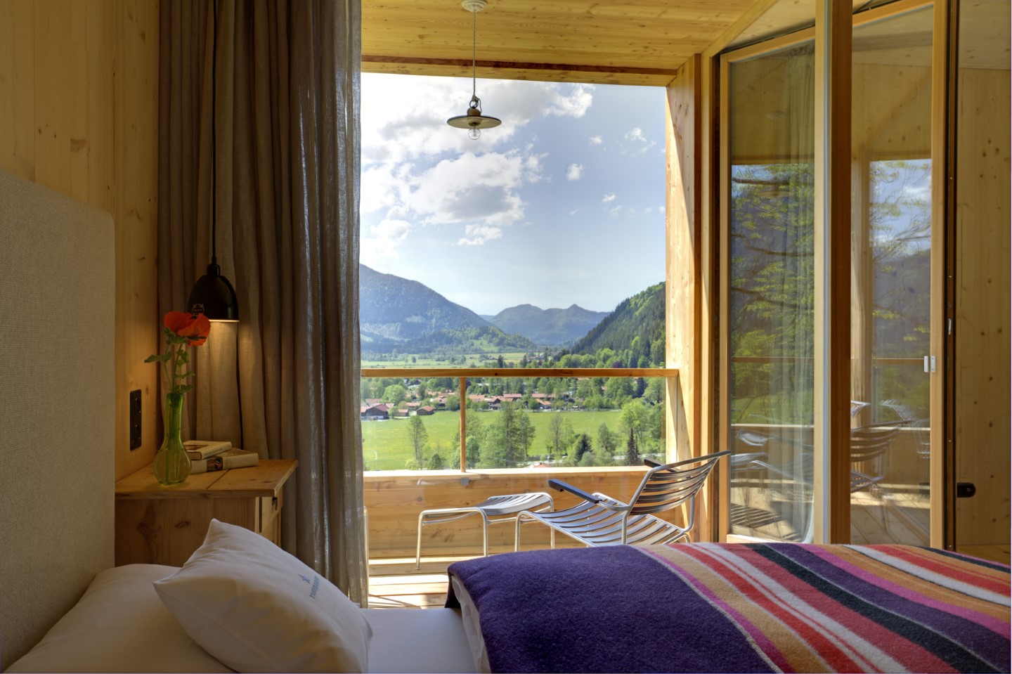 Im Bauernhaus der Alten Tann stehen insgesamt 11 große und kleine Almzimmer mit Balkon und teilweise mit Badewanne zur Verfügung. Holz regiert den Einrichtungsstil, alpin und modern gleichermaßen, ohne kitschig zu sein, dazu kommen Upcycling-Möbel. Fast jedes der zwischen 18 und 33 Quadratmeter großen Zimmer ist individuell und hat einen eigenen Balkon, eine Terrasse oder eine Loggia. Mariandlalm ist unser Tipp für diese Zimmerkategorie: durch die große Glasfront geht der Blick ins Tal.
