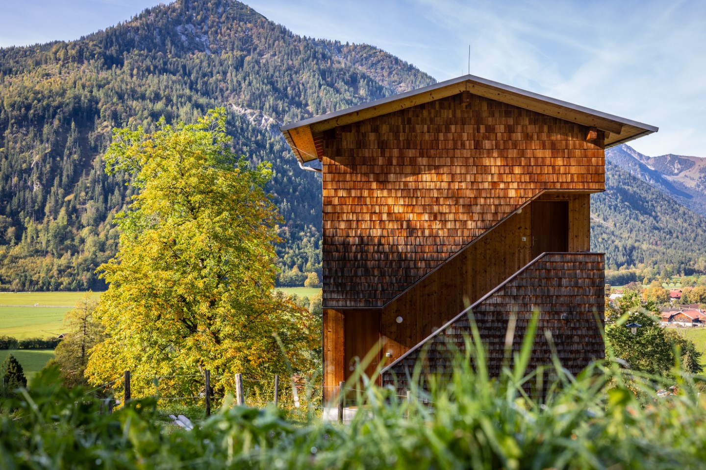 Sehr besonders sind die 4 Hüttentürme, jeder besteht aus 3 Zimmern. Sie wurden vom Münchner Architekten Florian Nagler entworfen und liegen oberhalb der Hauptgebäude. So hat man zwar etwas Fußweg zu Restaurant und Wellnessbereich, genießt jedoch auch die besondere Freiheit. Der kurze Spaziergang zu den Hauptgebäuden ist für viele Gäste sogar ein Plus.