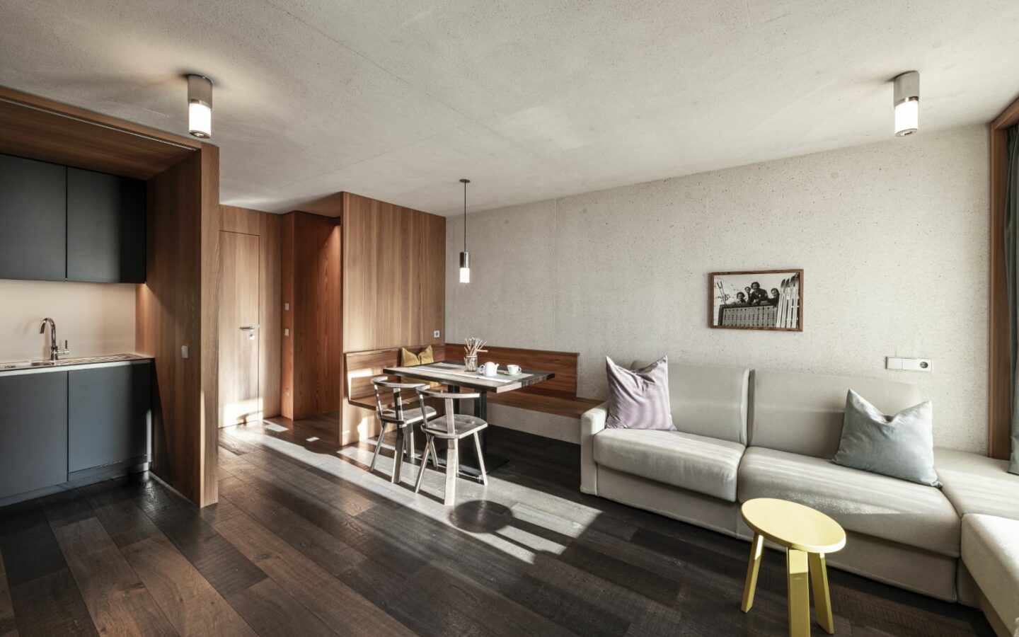 Die Liebe zur Natur ist im La Paula Hotel & Apartments an allen Ecken spürbar. Zirbenholz trifft Sichtbeton, die Bäder sind mit Mosaiksteinen in Grüntönen gefliest und von Balkonen und Terrassen geht der Blick in die schneebedeckte Bergwelt.