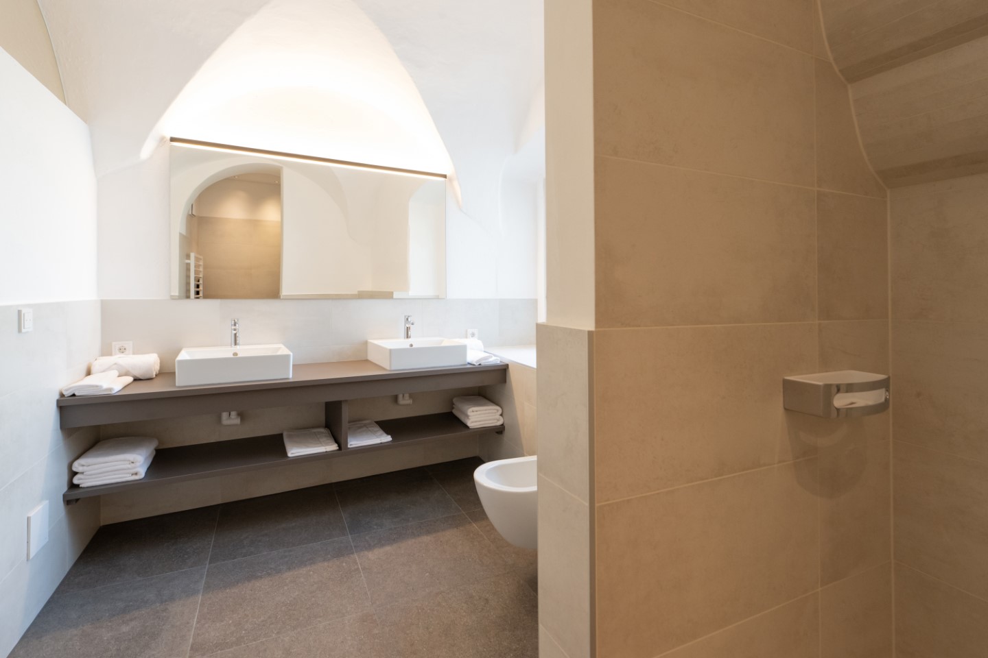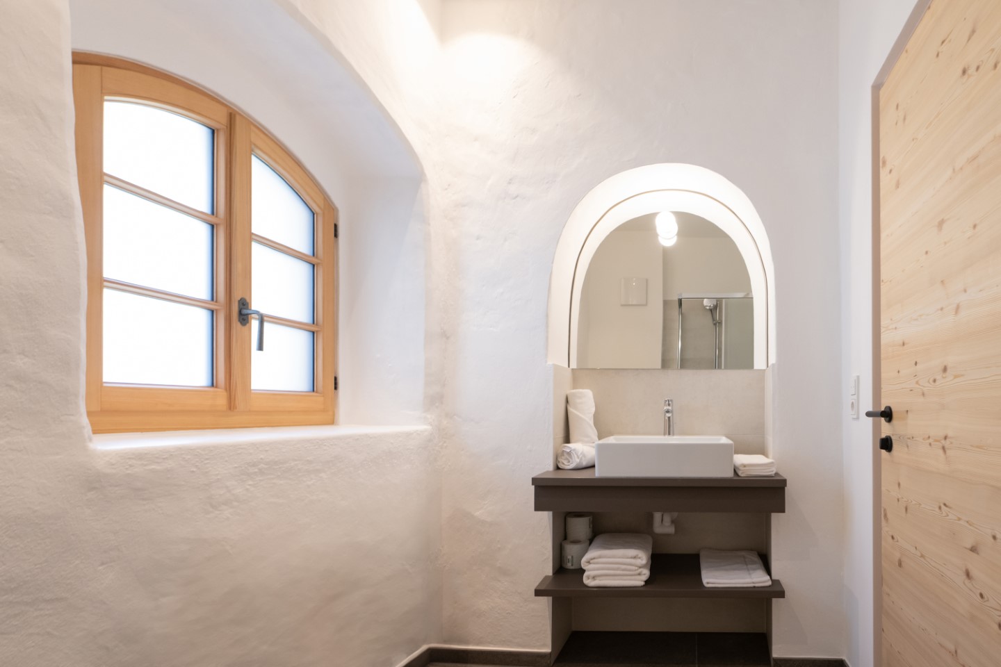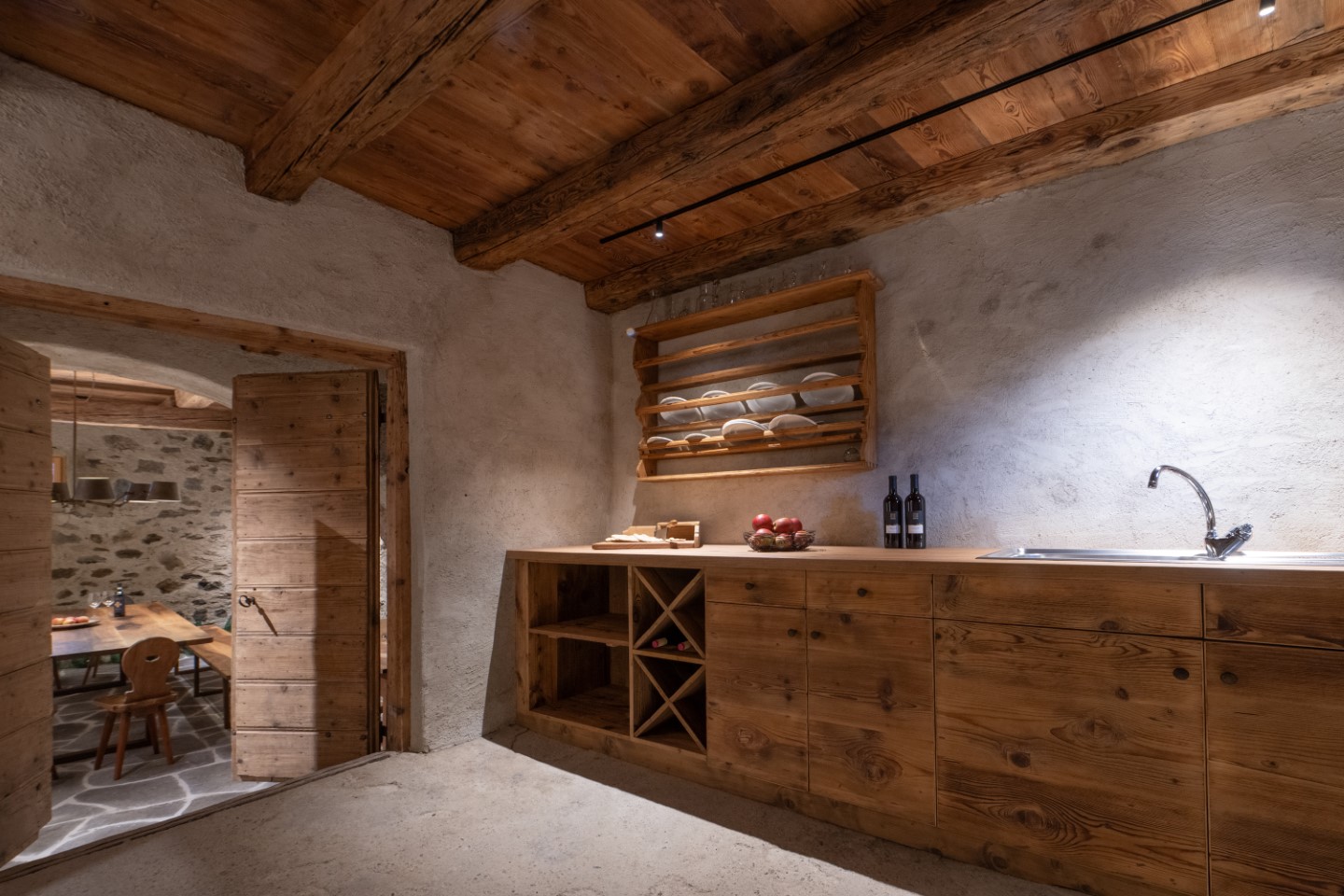 Antikes trifft jetzt auf moderne Werke von den Südtiroler Künstlern Heiner Gschwendt, Paul Flora, Josef Mahlknecht, Karl Grasser und Markus’ Großonkel Alois Thalguter. Steinmauern, Rundbögen, Erker und Holztäfelungen leben harmonisch mit modernen offenen Küchen, handgezimmerten Esstischmöbeln aus Lärchenholz und puristischer Badgestaltung.