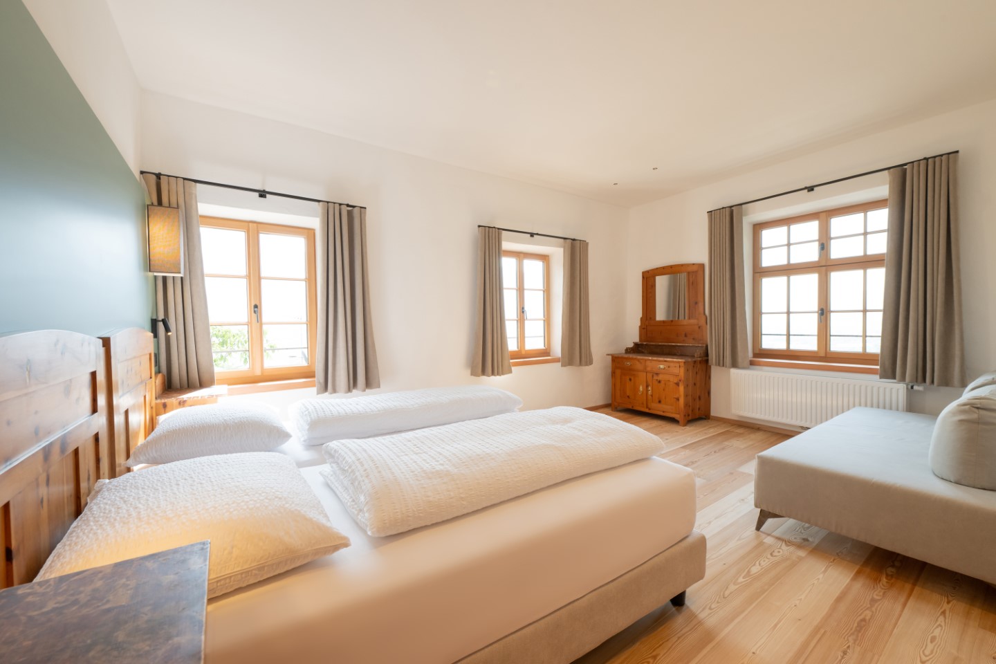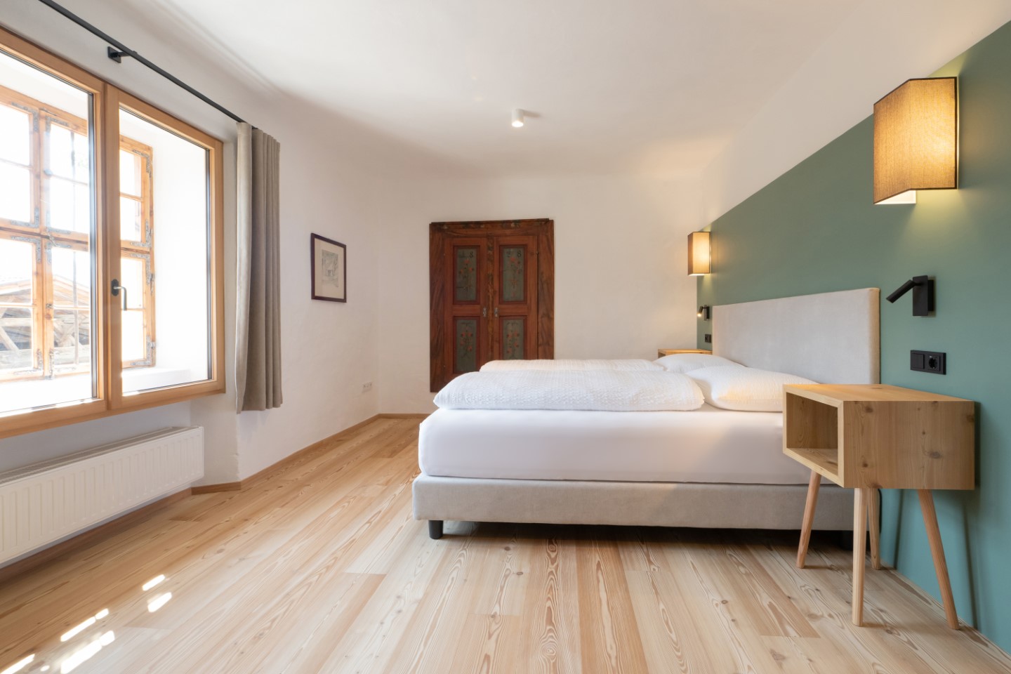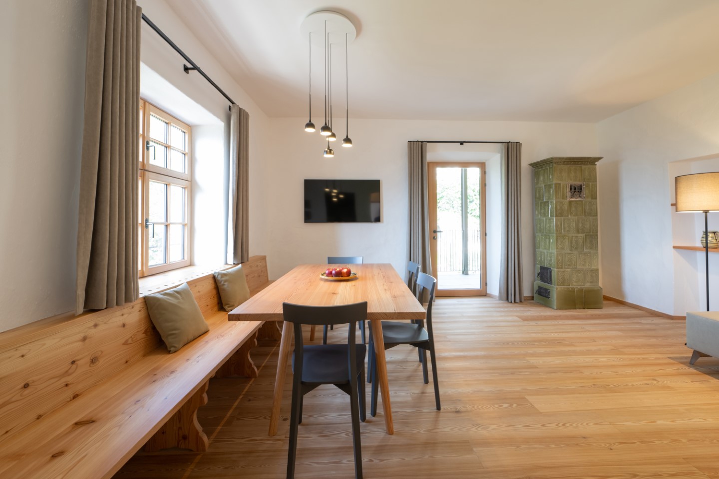 Alles hat eine echte Geschichte, manches eine sehr lange. Wie die 300 Jahre alte Bauernstube im Apartment Johann. Ein Gefühl von Schlichtheit und Wärme verbreiten auch die Echtholzböden und die Farbakzente in gedämpftem Grün.