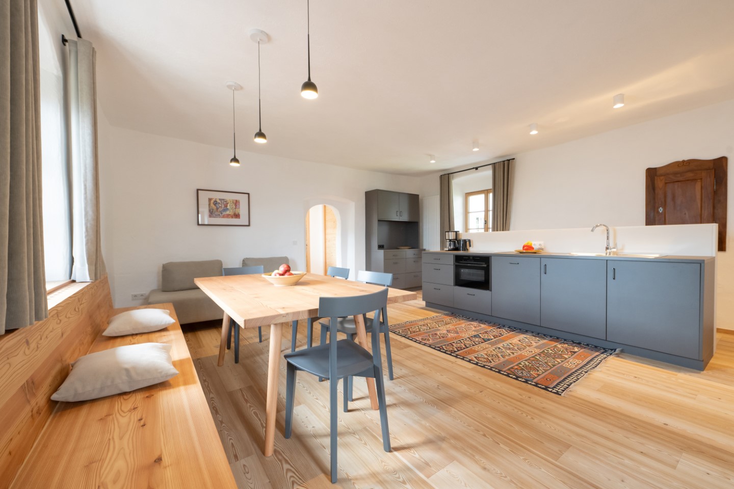 Für die nur drei Ferienwohnungen mit einer Größe zwischen 70 und 80 Quadratmetern konnte noch sehr vieles restauriert und ins Heute gebracht werden. Originale Türen, Kachelöfen und Details sorgen dafür, dass man hier Geschichte atmet. Gleichzeitig wurde unheimlich aufwändig renoviert.